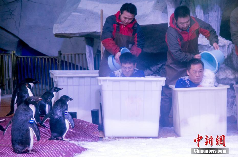 8月11日,在企鵝館舉行的決賽中,工作人員給參賽選手桶里加冰塊。當日,一場充滿趣味性的“冰極挑戰(zhàn)賽”在武漢海昌極地海洋世界上演,參賽者們經(jīng)過“極地初體驗”和“極寒企鵝館耐寒挑戰(zhàn)”兩個環(huán)節(jié),堅持時間長者獲勝。中新社記者張暢 攝