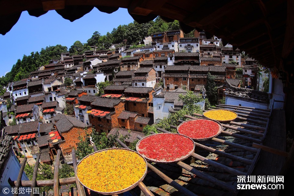 ??? 深圳新聞網(wǎng)訊 2018年8月7日,江西婺源縣篁嶺古村落,壯觀“曬秋”場(chǎng)景。當(dāng)日立秋節(jié)氣,江西婺源縣篁嶺古村的農(nóng)作物普遍豐收,村民們又迎來了一年一度的“曬秋”季。村民們將收獲來的紅辣椒、玉米、南瓜、稻谷和菊花等色彩斑斕的農(nóng)作物,晾曬在依山而建的徽派民居房前屋后的木制曬架上,在秋日陽光的照射下,色彩繽紛圓圓的曬扁,鋪就在錯(cuò)落有致的徽派民居之間,格外璀璨奪目,蔚為壯觀。目前,“篁嶺曬秋”已經(jīng)成為中國鄉(xiāng)村旅游的一張名片。