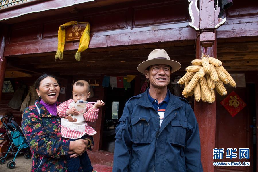 寧蒗永寧鄉(xiāng)泥鰍溝村委會八珠村民小組的摩梭人阿普私根(右)站在自家門口(7月30日攝)。他家是摩梭母系家庭重點保護(hù)民居,依靠旅游服務(wù)等家庭年收入近20萬元。新華社記者 胡超 攝