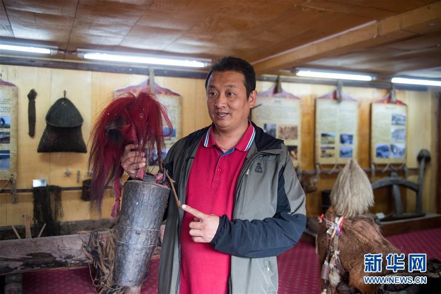 摩梭人次仁多吉在寧蒗永寧鄉(xiāng)落水村的摩梭民俗博物館里介紹他收藏的馬幫頭騾鈴(7月30日攝)。 新華社記者 胡超 攝