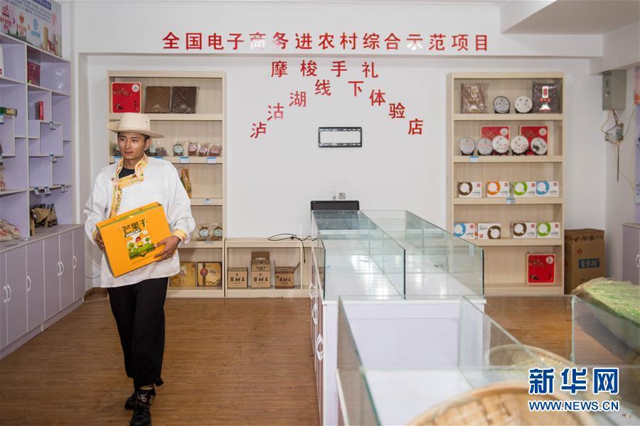 摩梭青年次里打史在寧蒗永寧鄉(xiāng)落水村的電子商務(wù)體驗店里整理商品(7月31日攝)。 新華社記者 胡超 攝