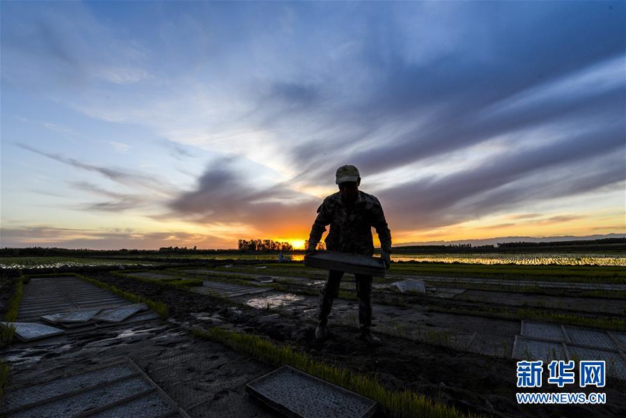 新疆察布查爾錫伯自治縣種羊場托海依村的村民在農(nóng)田里搬運秧苗(5月21日攝)。近日,隨著氣溫漸高,地處新疆伊犁河谷的察布查爾錫伯自治縣迎來插秧高峰期,田間地頭一派繁忙景象。塊塊稻田水滿如鏡,田間防護林枝繁葉茂,遠處雪山依稀可見,如一幅在大地上鋪展開的生態(tài)畫卷。新華社記者胡虎虎 攝