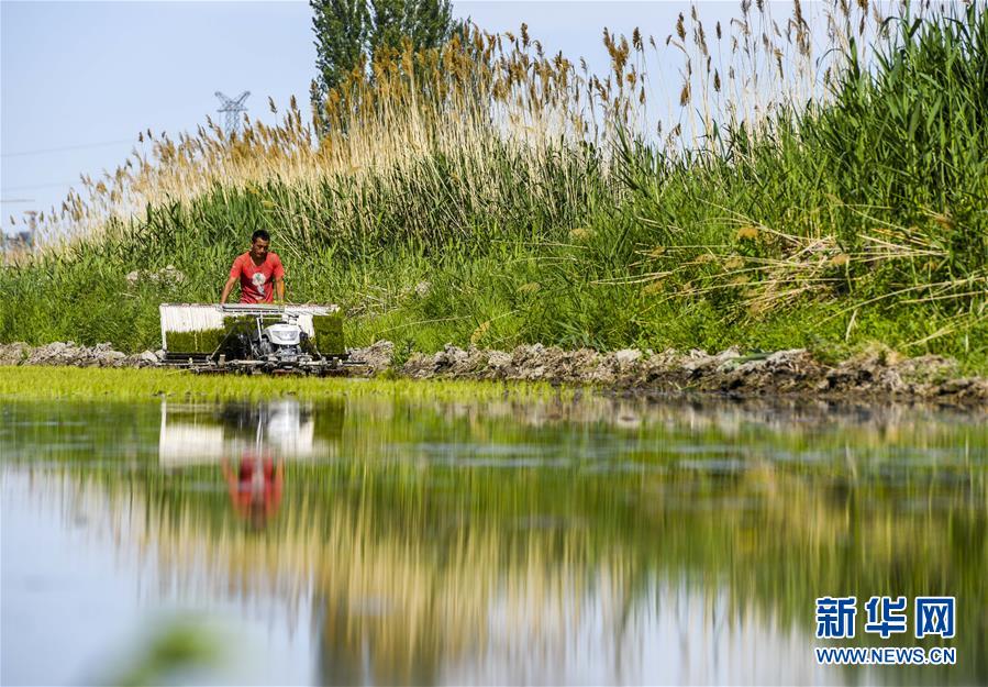 新疆察布查爾錫伯自治縣種羊場托海依村村民在農(nóng)田里插秧(5月21日攝)。近日,隨著氣溫漸高,地處新疆伊犁河谷的察布查爾錫伯自治縣迎來插秧高峰期,田間地頭一派繁忙景象。塊塊稻田水滿如鏡,田間防護(hù)林枝繁葉茂,遠(yuǎn)處雪山依稀可見,如一幅在大地上鋪展開的生態(tài)畫卷。新華社記者胡虎虎 攝