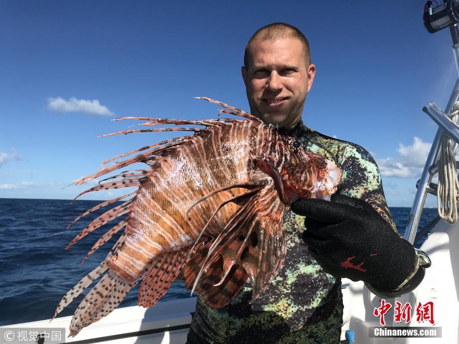 8月21日訊(具體拍攝時間不詳),近日,來自長島的Timothy Blasko打破了記錄,他捕獲了大西洋最重的獅子魚。37歲的Timothy Blasko是一名技術(shù)精湛的捕魚者,當天,他和朋友們在佛羅里達群島伊斯拉莫拉達海岸捕魚時,遇到了這條大魚。Timothy向朋友要來了魚叉,瞄準大魚的下方位置叉去,正中目標成功捕獲。當他們把這條魚和當天捕獲的其它魚排在一起時,他們猜測這條魚可能會破紀錄?!八喼笔仟{子魚中的哥斯拉!” Timothy描述道,“這條巨大的獅子魚重達3.1磅,刷新了大西洋迄今最重獅子魚的國家紀錄。”圖片來源:視覺中國