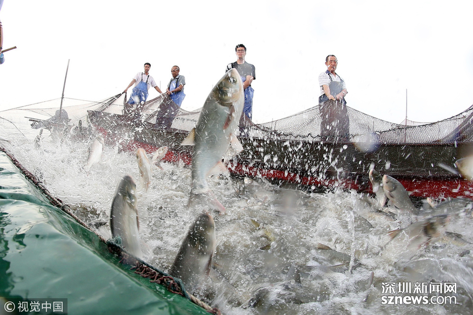 ???? 2018年6月26日,江蘇省常州市嘉澤鎮(zhèn)捕撈村的漁民組織夏季捕撈,一網(wǎng)魚達(dá)五萬余斤,以鰱魚為主,供應(yīng)市場需求。夏捕的魚價(jià)較平時(shí)有所上漲,漁民粗略估計(jì)可增收上萬余元。