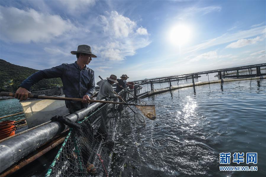8月18日,南麂島海域的“海上牧場”養(yǎng)殖區(qū)內(nèi),漁民正捕撈大黃魚,處于仿生養(yǎng)殖環(huán)境的大黃魚需要生長2至3年。進(jìn)入8月,浙江省溫州市平陽縣南麂鎮(zhèn)海域上大片的大黃魚、貽貝等特色海產(chǎn)品養(yǎng)殖區(qū)域迎來豐收季節(jié),養(yǎng)殖戶們駕駛漁船在養(yǎng)殖區(qū)海域進(jìn)行打撈收獲,在碧海藍(lán)天下構(gòu)成了一幅“海上牧場”的美麗豐收景象。近年來,南麂鎮(zhèn)政府引導(dǎo)漁民養(yǎng)殖戶充分發(fā)揮“靠海吃海”的資源優(yōu)勢,大力發(fā)展海洋養(yǎng)殖經(jīng)濟(jì)和海島旅游經(jīng)濟(jì),實現(xiàn)了南麂由“生態(tài)美”向“產(chǎn)業(yè)美”,“產(chǎn)業(yè)美”向“經(jīng)濟(jì)美”的轉(zhuǎn)變。同時該鎮(zhèn)堅持以大黃魚、貽貝等為特色產(chǎn)業(yè)支撐,精準(zhǔn)發(fā)展高效海洋養(yǎng)殖業(yè),重點培養(yǎng)一批新型職業(yè)漁民,依靠專業(yè)技術(shù)支持,實現(xiàn)深海仿生養(yǎng)殖,讓好生態(tài)造就好品質(zhì),重點打造南麂養(yǎng)殖品牌,組建營銷網(wǎng)絡(luò),拓展特色海產(chǎn)品市場。新華社記者 徐昱攝
