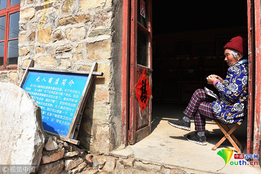 2018年3月11日,在山東省日照市五蓮縣街頭鎮(zhèn)大山深處的李崮寨村,負(fù)責(zé)管理“無(wú)人商店”的老人惠玉秀坐在商店門口納鞋墊。