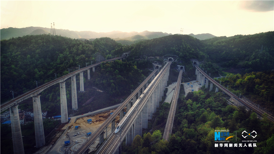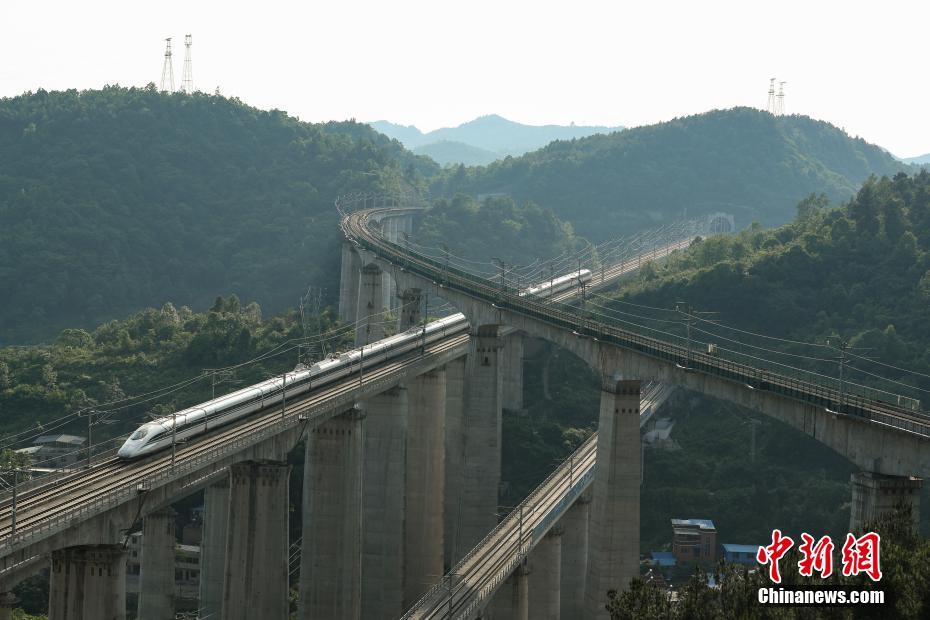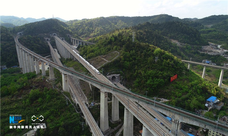 5月16日,航拍貴陽市郊交織的五條高鐵線路,一列動(dòng)車駛出隧道。貴州省地處中國(guó)西南腹地,高原山地居多,因此高鐵建設(shè)的橋隧占比較高。在貴陽市烏當(dāng)區(qū)新添寨,高鐵滬昆線、貴廣客運(yùn)專線、貴開城際客運(yùn)專線的隧道和橋梁交織在一起,形成“五洞五橋”并行。中新社記者賀俊怡 攝 5月16日,一列動(dòng)車從貴陽市郊交織的橋梁上駛過。貴州省地處中國(guó)西南腹地,高原山地居多,因此高鐵建設(shè)的橋隧占比較高。在貴陽市烏當(dāng)區(qū)新添寨,高鐵滬昆線、貴廣客運(yùn)專線、貴開城際客運(yùn)專線的隧道和橋梁交織在一起,形成“五洞五橋”并行。中新社記者賀俊怡 攝