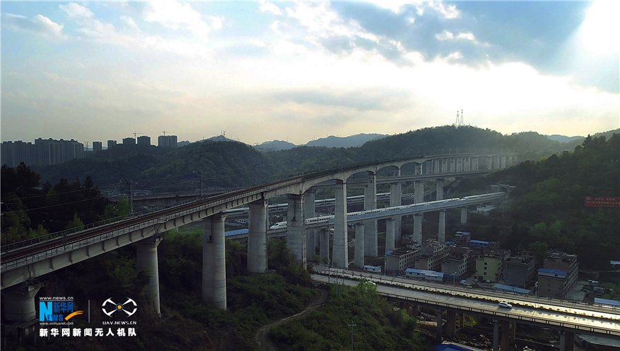 貴州省地處中國(guó)西南腹地,全省高原山地居多,因此高鐵建設(shè)的橋隧占比較高。在貴陽(yáng)市烏當(dāng)區(qū)新添寨,高鐵滬昆線、貴廣客運(yùn)專線、貴開(kāi)城際客運(yùn)專線的隧道和橋梁交織在一起,形成“五洞五橋”并行,形似“五龍出海”的壯觀景象。圖為3月29日,新華網(wǎng)無(wú)人機(jī)航拍兩輛動(dòng)車在線路上會(huì)車。新華網(wǎng)周遠(yuǎn)鋼 攝