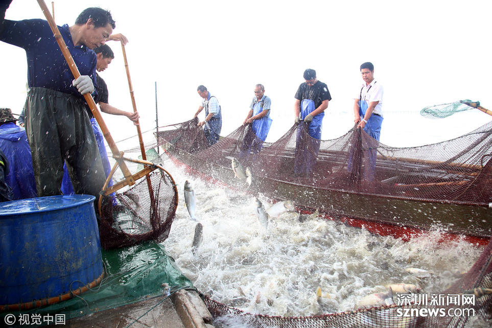 2018年6月26日,江蘇省常州市嘉澤鎮(zhèn)捕撈村的漁民組織夏季捕撈,一網(wǎng)魚達(dá)五萬余斤,以鰱魚為主,供應(yīng)市場(chǎng)需求。夏捕的魚價(jià)較平時(shí)有所上漲,漁民粗略估計(jì)可增收上萬余元。