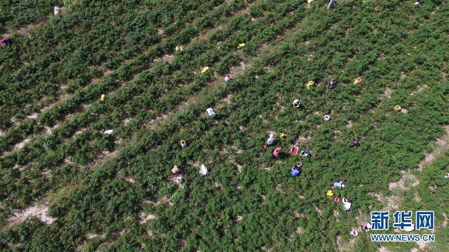 9月16日,阜城縣王集鄉(xiāng)南張莊村農(nóng)民在采摘辣椒(無人機(jī)拍攝)。近年來,河北省阜城縣王集鄉(xiāng)在推進(jìn)產(chǎn)業(yè)富民過程中,積極引導(dǎo)農(nóng)民調(diào)整農(nóng)業(yè)產(chǎn)業(yè)結(jié)構(gòu),按照品種特色化、種植規(guī)?;a(chǎn)銷一體化的“公司+基地+農(nóng)戶”的經(jīng)營(yíng)模式,鼓勵(lì)農(nóng)民發(fā)展特色辣椒種植,推行“訂單種植”模式,開辟出了一條農(nóng)民創(chuàng)收新路徑。目前,阜城縣王集鄉(xiāng)辣椒種植面積3100余畝,每畝年收益2500元以上,帶動(dòng)當(dāng)?shù)剞r(nóng)民實(shí)現(xiàn)增收。新華社記者朱旭東攝