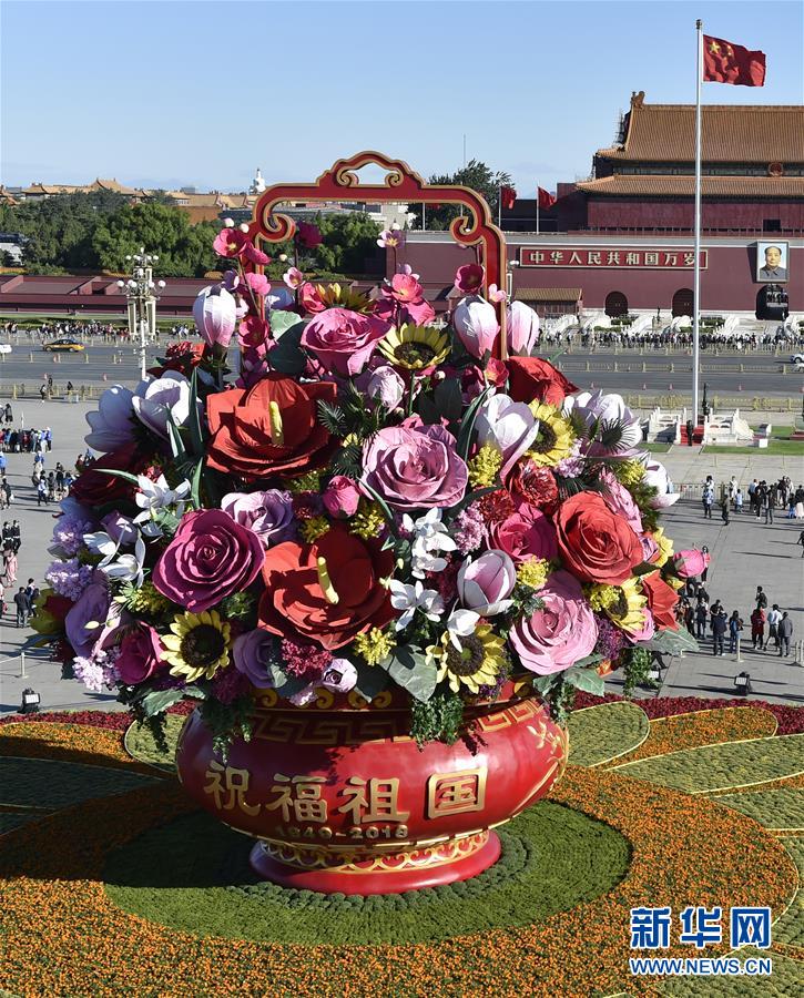 9月23日在北京天安門廣場拍攝的“祝福祖國” 巨型花籃。