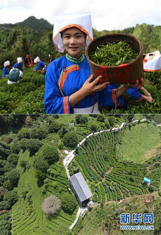這張拼版照片顯示的是:上圖,9月20日,廣西金秀瑤族自治縣金秀鎮(zhèn)六段村村民蘇思林展示剛采摘的秋茶;下圖,9月20日,茶農(nóng)在金秀鎮(zhèn)六段村茶園內(nèi)采茶(無(wú)人機(jī)拍攝)。  新華社記者陸波岸攝