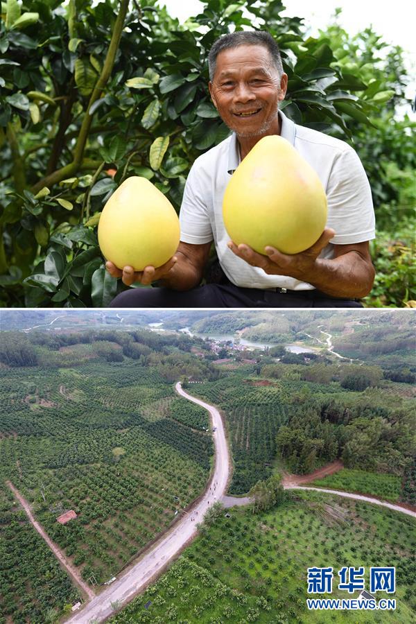這張拼版照片顯示的是:上圖,9月18日,廣西武宣縣東鄉(xiāng)鎮(zhèn)風(fēng)沿村村民陳紹桂展示剛采摘的蜜柚;下圖,9月18日,人們?cè)陲L(fēng)沿村三紅蜜柚種植基地內(nèi)行走(無(wú)人機(jī)拍攝)。  新華社記者陸波岸攝