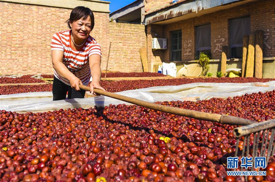 9月22日,河北省棗強(qiáng)縣棗強(qiáng)鎮(zhèn)孟家莊村的棗農(nóng)在晾曬紅棗。 近日,河北省棗強(qiáng)縣的2000多畝棗園迎來(lái)收獲季,棗農(nóng)們搶抓農(nóng)時(shí),采摘、篩選、晾曬紅棗,樂(lè)享秋收的快樂(lè)。 新華社記者李曉果攝
