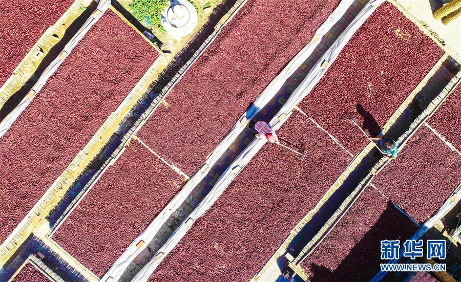 9月22日,河北省棗強(qiáng)縣棗強(qiáng)鎮(zhèn)孟家莊村的棗農(nóng)在晾曬紅棗(無(wú)人機(jī)拍攝)。 近日,河北省棗強(qiáng)縣的2000多畝棗園迎來(lái)收獲季,棗農(nóng)們搶抓農(nóng)時(shí),采摘、篩選、晾曬紅棗,樂(lè)享秋收的快樂(lè)。 新華社記者李曉果攝