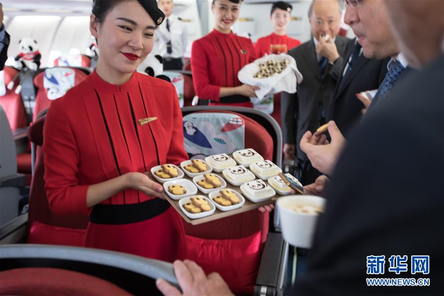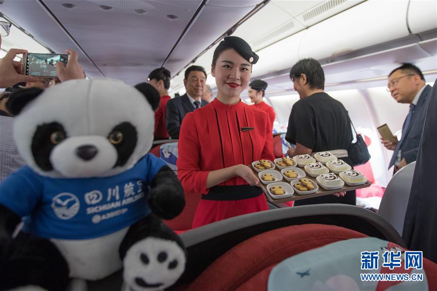9月26日,在以色列特拉維夫本·古里安國際機場,四川航空公司空乘人員在機上展示熊貓主題的小吃。  新華社記者郭昱攝