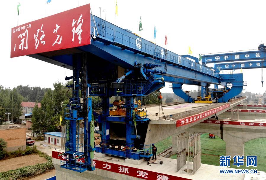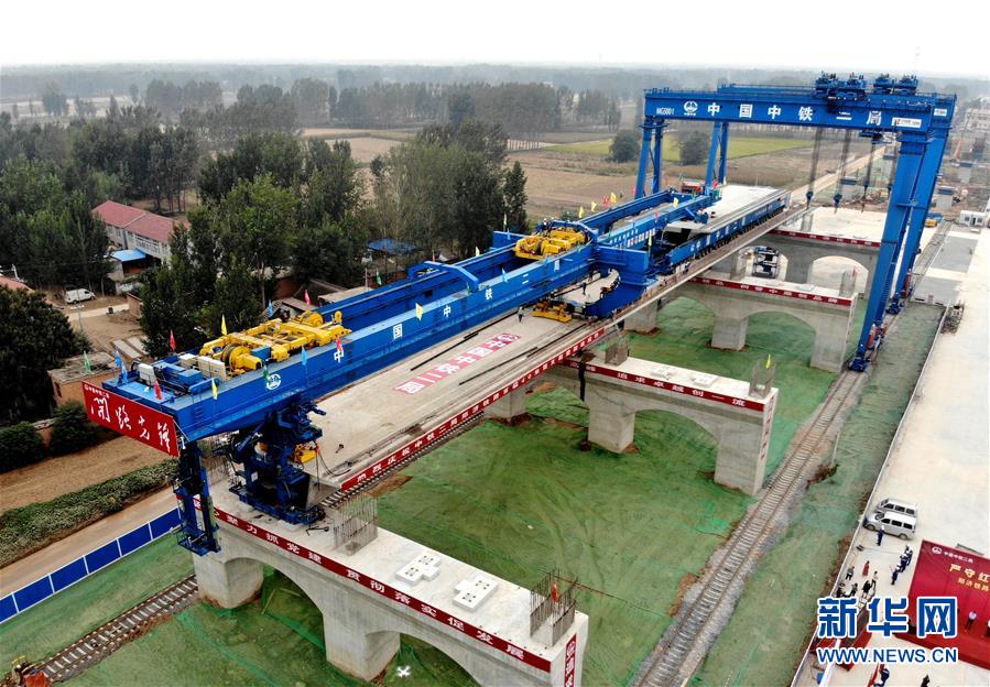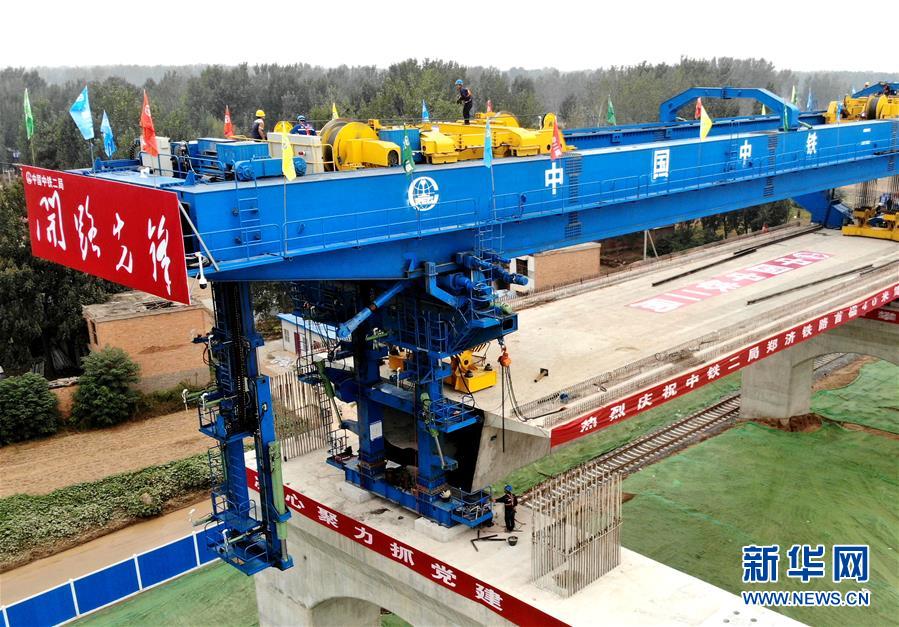 9月27日,中鐵二局的施工人員使用大型機械在鄭(州)濟(南)高速鐵路(鄭濮段)站前工程VI標(biāo)施工現(xiàn)場架設(shè)40米簡支箱梁(無人機拍攝)。 新華社記者李安攝