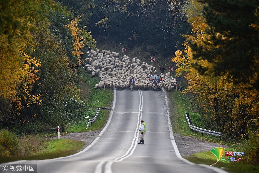 2018年9月27日訊(具體拍攝時(shí)間不詳),波蘭,浩浩蕩蕩的綿羊大軍為了趕在冬天之前回到農(nóng)場過冬,阻斷了鄉(xiāng)村的主車道。