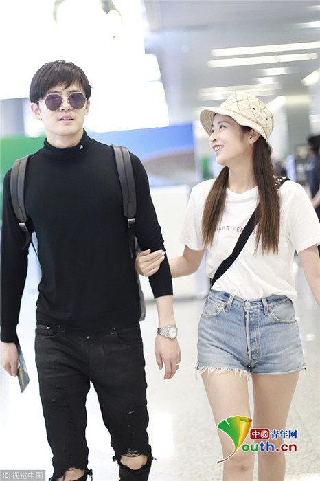 2018年9月26日,上海,穎兒、付辛博夫婦亮相機場。穎兒身穿白T恤和牛仔短褲露出纖細美腿十分養(yǎng)眼,一路挽著老公的手十分恩愛甜蜜,日前,穎兒還在節(jié)目上痛哭述說自己與付辛博新婚相處的苦楚。