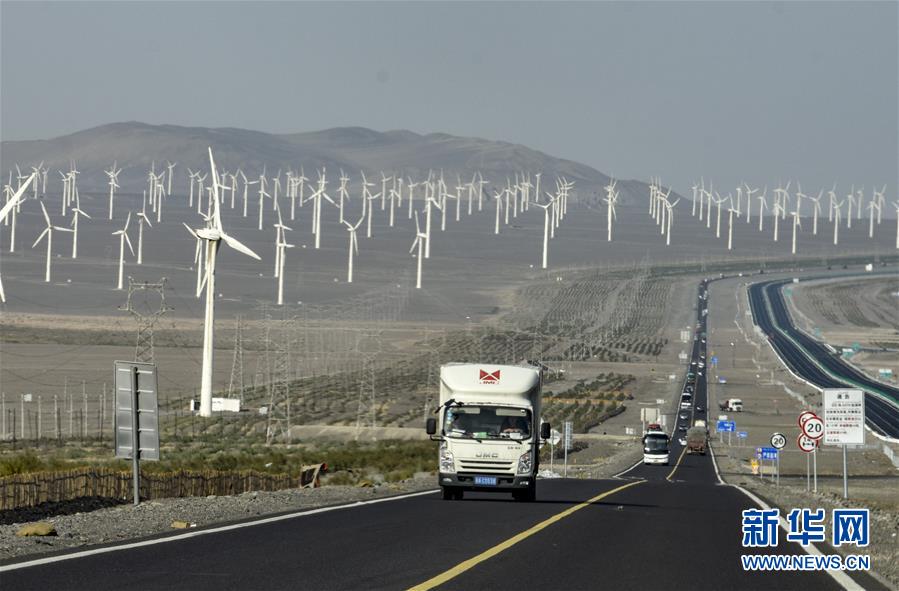 汽車(chē)行駛在新疆吐魯番市郊區(qū)風(fēng)力發(fā)電場(chǎng)一旁的公路上(9月22日攝)。新華社記者趙戈 攝