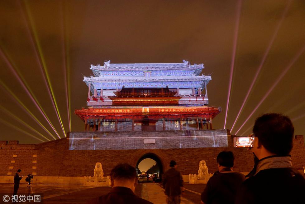 永定門城樓南廣場(chǎng)舉辦的“我愛你中國(guó)”迎國(guó)慶燈光秀于2018年9月28日晚正式向市民首秀。即日起至10月7日,每晚這里都將啟動(dòng)燈光表演。