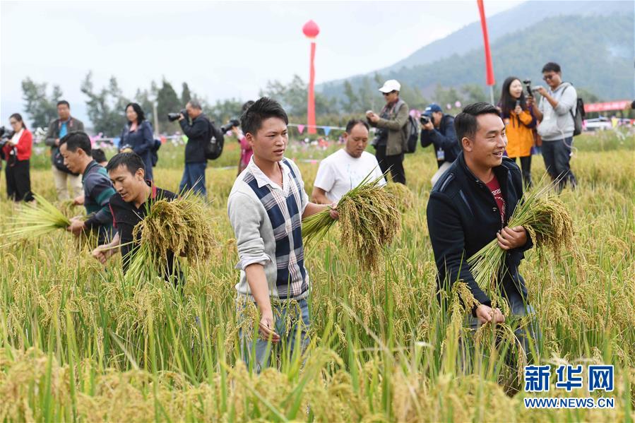 9月29日,人們參加拔谷穗比賽。9月29日,云南省尋甸回族彝族自治縣2018年首屆農民豐收節(jié)暨第二屆摸魚節(jié)在雞街鎮(zhèn)舉行,當?shù)剞r民和游客在豐收的稻田里進行摸魚、拔谷穗、山歌對唱等活動,享受收獲的喜悅。新華社記者楊宗友攝