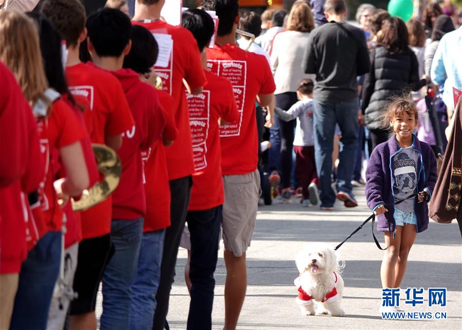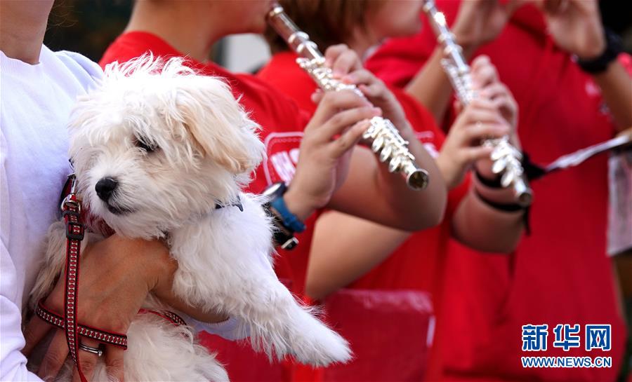 9月29日,在美國加利福尼亞州伯林蓋姆市,一支學生樂隊參加寵物狗大游行活動。美國加州舊金山灣區(qū)的伯林蓋姆市29日舉行寵物狗大游行活動。新華社記者吳曉凌攝