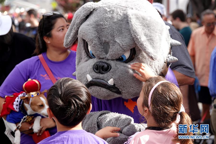 9月29日,在美國加利福尼亞州伯林蓋姆市,兒童參加寵物狗大游行活動時與卡通人偶互動。美國加州舊金山灣區(qū)的伯林蓋姆市29日舉行寵物狗大游行活動。新華社記者吳曉凌攝