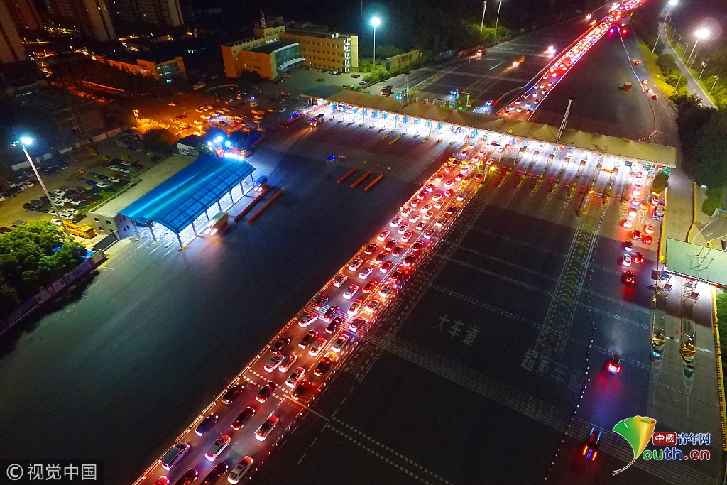 2018年10月1日,國慶假期首日凌晨1點(diǎn)左右,南京迎來出行高峰,所有高速公路出城方向迎來大批車輛,航拍南京長江二橋收費(fèi)站,大量車輛排起長龍,場(chǎng)面尤為壯觀。圖片作者:方東旭