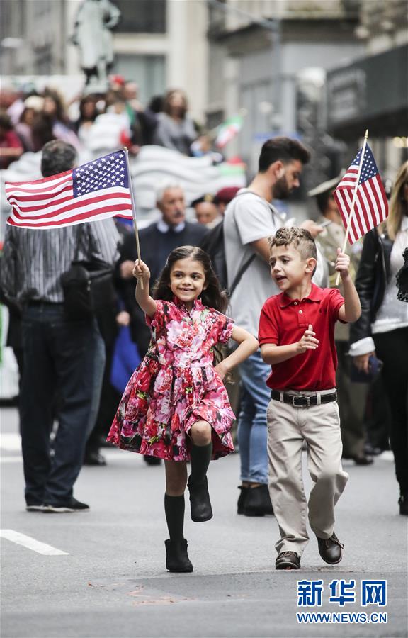 10月8日,在美國紐約曼哈頓第五大道,兩名兒童參加哥倫布日游行。  新華社記者王迎攝