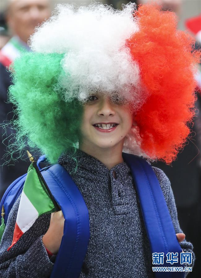 10月8日,在美國(guó)紐約曼哈頓第五大道,一名兒童參加哥倫布日游行。 新華社記者王迎攝