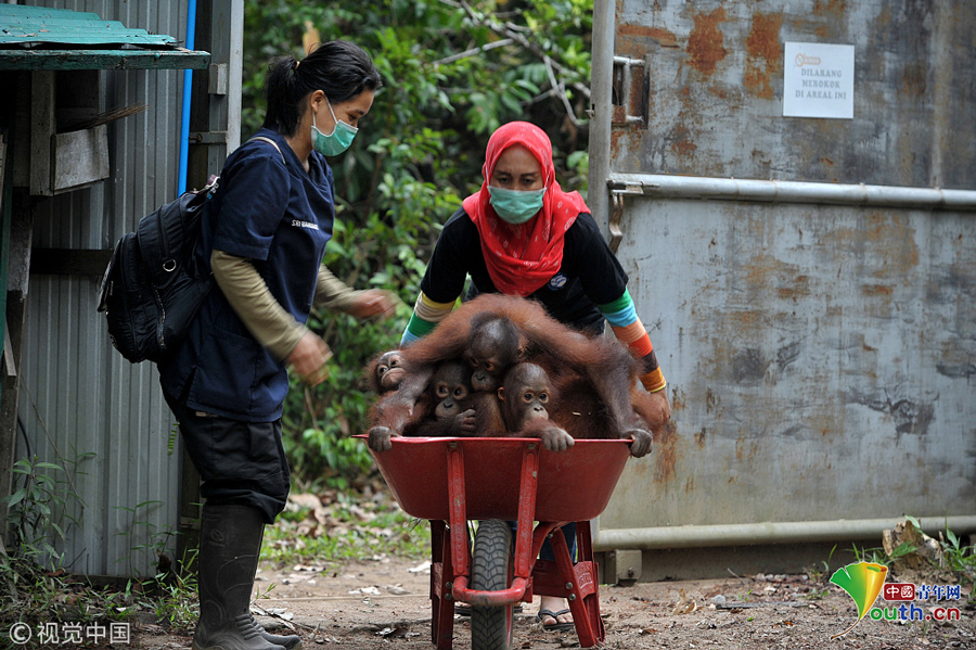 印尼加里曼丹克塔邦,國(guó)際動(dòng)物救援(IAR)猩猩安全與保護(hù)中心里,飼養(yǎng)員用獨(dú)輪車把猩猩寶寶送到森林學(xué)校。圖片作者:Newscom