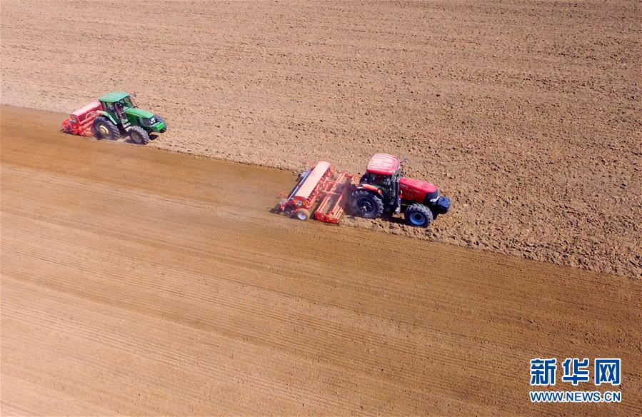 10月14日,河北省南和縣閆里鄉(xiāng)閆里村農(nóng)民在田地播種冬小麥(無人機(jī)拍攝)。新華社記者 朱旭東 攝