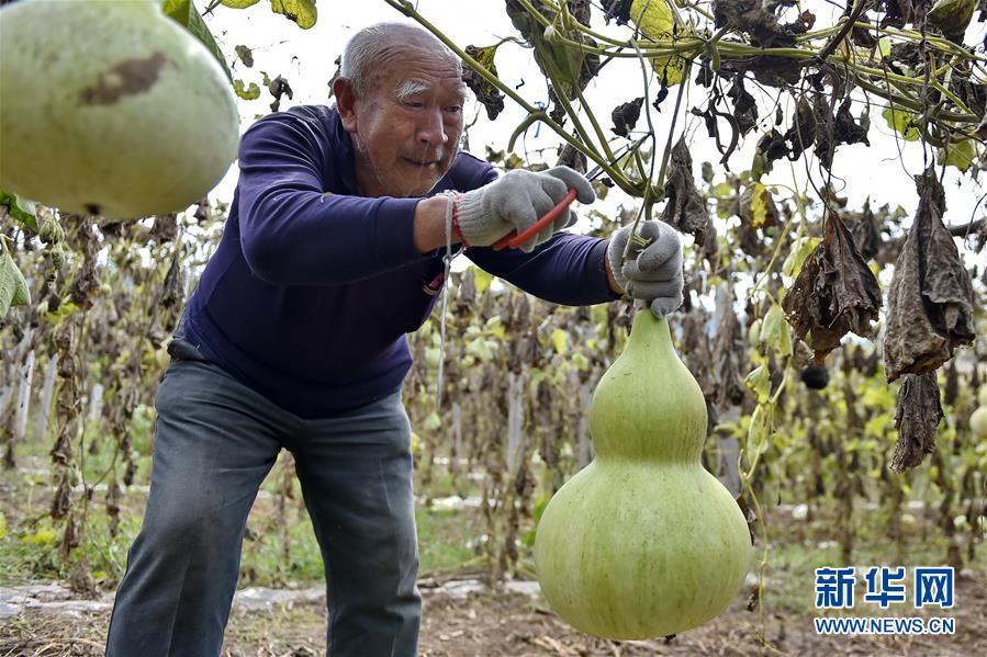 9月27日,山西省安澤縣和川鎮(zhèn)孔旺村的村民在摘葫蘆。近日,山西省安澤縣和川鎮(zhèn)孔旺村種植的葫蘆喜獲豐收,村民們忙著將摘下的葫蘆去皮晾干??淄逵?016年成立葫蘆種植合作社,種植、采摘、加工等環(huán)節(jié)全部由貧困戶負(fù)責(zé),為貧困戶拓寬增收渠道。新華社記者 曹陽 攝