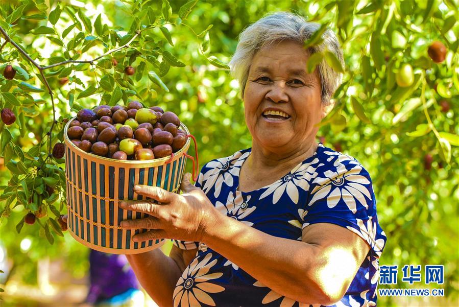 9月22日,河北省棗強(qiáng)縣棗強(qiáng)鎮(zhèn)孟家莊村的棗農(nóng)在展示剛剛收獲的紅棗。 近日,河北省棗強(qiáng)縣的2000多畝棗園迎來收獲季,棗農(nóng)們搶抓農(nóng)時,采摘、篩選、晾曬紅棗,樂享秋收的快樂。 新華社記者李曉果攝