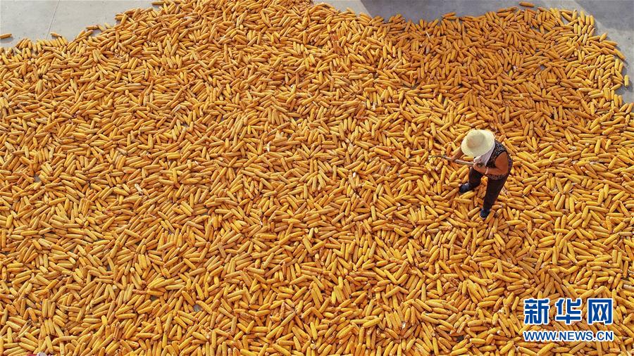 10月14日,河北省南和縣閆里鄉(xiāng)閆里村農(nóng)民在晾曬收獲的玉米(無人機(jī)拍攝)。