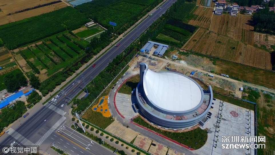2018年6月13日,航拍河南淮陽一座即將竣工落成的體育場(chǎng)館建筑,市民稱酷似一個(gè)石磨盤。