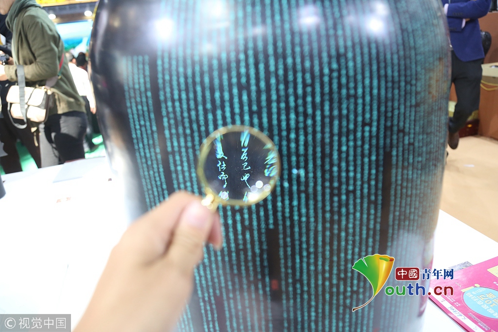 2018年10月14日,山東濟南,高新會展中心濟南文博會現(xiàn)場,張務福老先生在黑陶鼎上刻字。