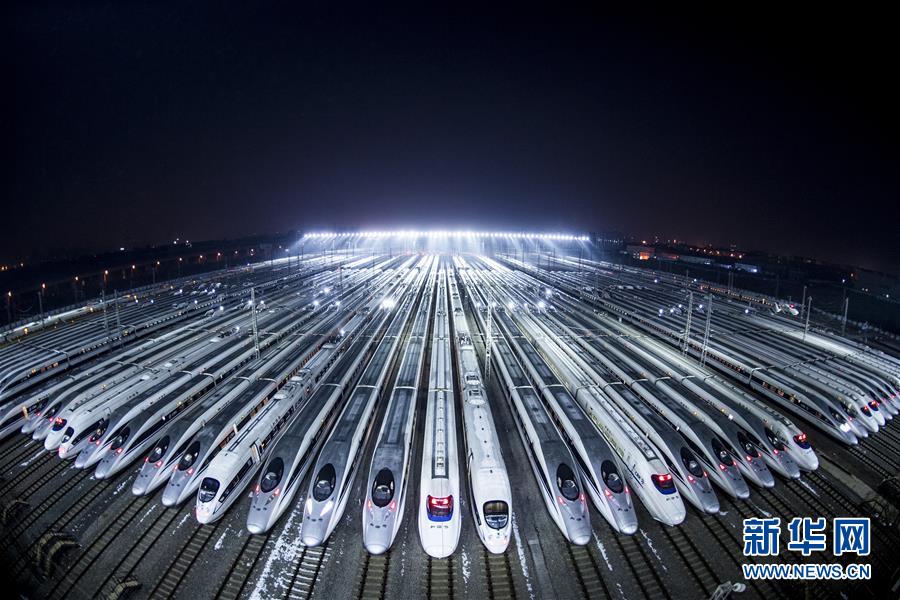 2018年2月1日凌晨,動車組??吭谖錆h動車段的存車線上,準(zhǔn)備進(jìn)行檢修和保溫作業(yè)。近百組在武漢動車段經(jīng)過檢修、保溫作業(yè)的動車組蓄勢待發(fā),迎接春運(yùn)。新華社記者 肖藝九 攝