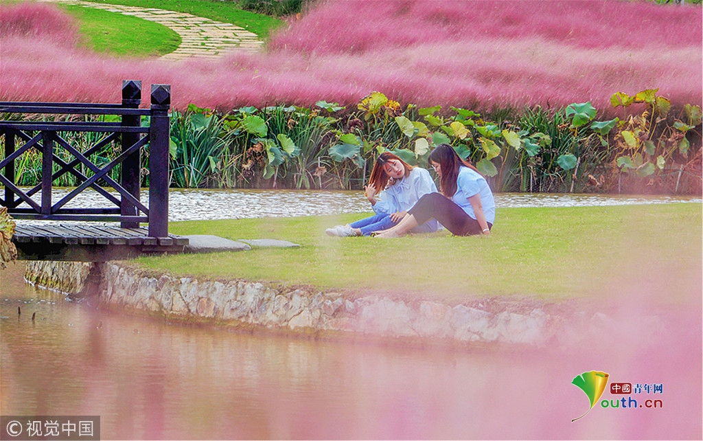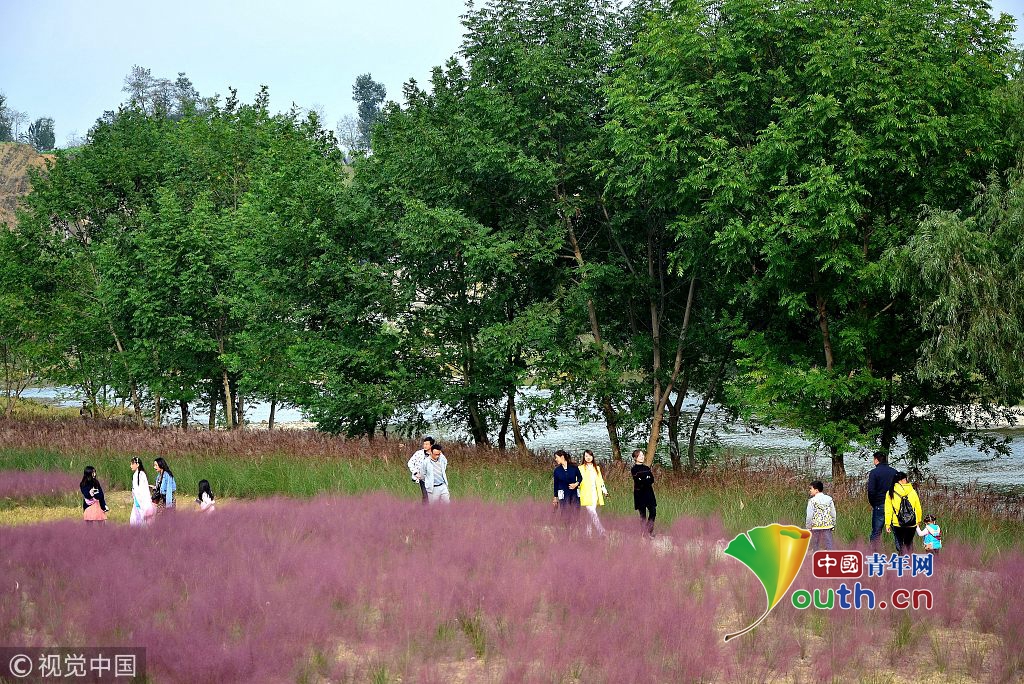 中國青年網(wǎng)北京10月7日電 2018年10月6日,游客在“粉色田野”里游玩、留影。粉黛亂子草是一種觀賞草種,該植物夏季為主要生長季,全株綠色,花期為9月中旬至11月中旬,開花時,綠葉為底,粉紫色花穗如發(fā)絲從基部長出,遠(yuǎn)看如紅色云霧。