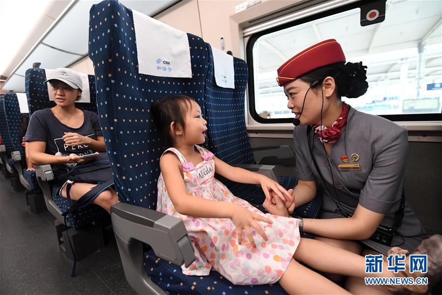 在南寧東站,一名列車工作人員在和一名小朋友交流(2017年8月5日攝)。 廣西壯族自治區(qū)成立60年來,鐵路建設(shè)發(fā)生翻天覆地的變化。來自中國鐵路南寧局集團(tuán)有限公司的數(shù)據(jù)顯示,1958年廣西鐵路總里程為1346.3公里,如今廣西鐵路總里程達(dá)5191公里。廣西與周邊相鄰省份間實現(xiàn)動車“公交化”開行。此外,北部灣港—重慶班列、東盟海產(chǎn)品冷鏈班列、“百色一號”果蔬專列等的開通和運(yùn)營,強(qiáng)化了鐵路供給的針對性和有效性。鐵路成為助推廣西經(jīng)濟(jì)社會快速發(fā)展的“大動脈”。 新華社記者陸波岸攝