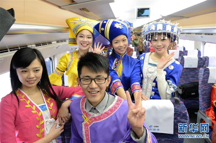 在廣西南寧站,身著民族服裝的乘客搭乘動車準(zhǔn)備出行(2013年12月30日攝)。 廣西壯族自治區(qū)成立60年來,鐵路建設(shè)發(fā)生翻天覆地的變化。來自中國鐵路南寧局集團(tuán)有限公司的數(shù)據(jù)顯示,1958年廣西鐵路總里程為1346.3公里,如今廣西鐵路總里程達(dá)5191公里。廣西與周邊相鄰省份間實現(xiàn)動車“公交化”開行。此外,北部灣港—重慶班列、東盟海產(chǎn)品冷鏈班列、“百色一號”果蔬專列等的開通和運(yùn)營,強(qiáng)化了鐵路供給的針對性和有效性。鐵路成為助推廣西經(jīng)濟(jì)社會快速發(fā)展的“大動脈”。 新華社記者周華攝