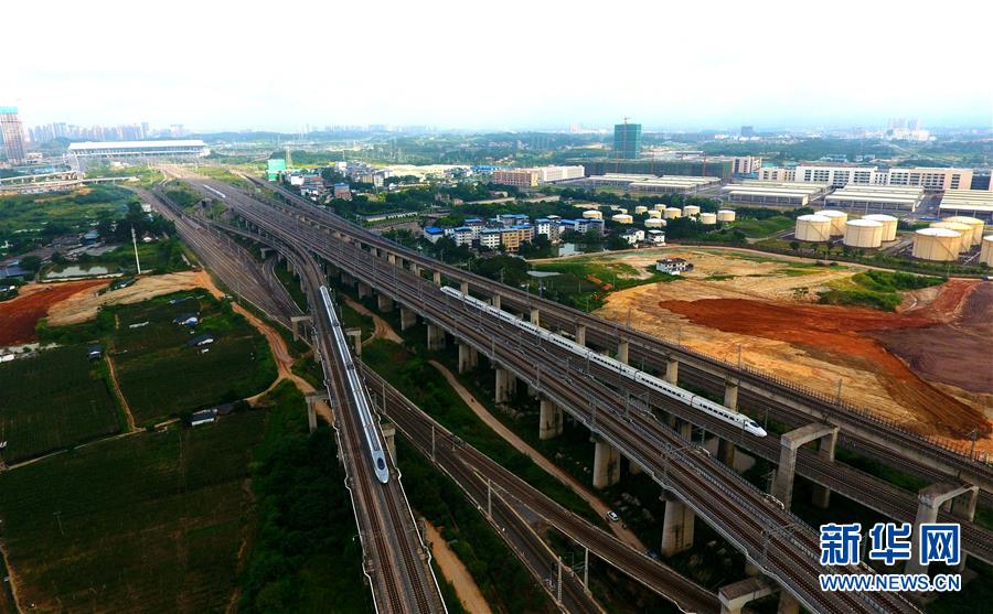 一列動車在南寧市區(qū)行駛(9月4日無人機(jī)拍攝)。 廣西壯族自治區(qū)成立60年來,鐵路建設(shè)發(fā)生翻天覆地的變化。來自中國鐵路南寧局集團(tuán)有限公司的數(shù)據(jù)顯示,1958年廣西鐵路總里程為1346.3公里,如今廣西鐵路總里程達(dá)5191公里。廣西與周邊相鄰省份間實現(xiàn)動車“公交化”開行。此外,北部灣港—重慶班列、東盟海產(chǎn)品冷鏈班列、“百色一號”果蔬專列等的開通和運(yùn)營,強(qiáng)化了鐵路供給的針對性和有效性。鐵路成為助推廣西經(jīng)濟(jì)社會快速發(fā)展的“大動脈”。 新華社記者陸波岸攝