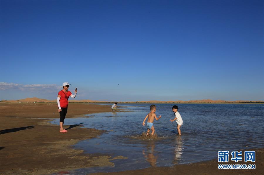 恩格貝月亮湖猶如鑲嵌在沙漠綠洲里的一塊碧玉。(新華網(wǎng) 王宇 攝)