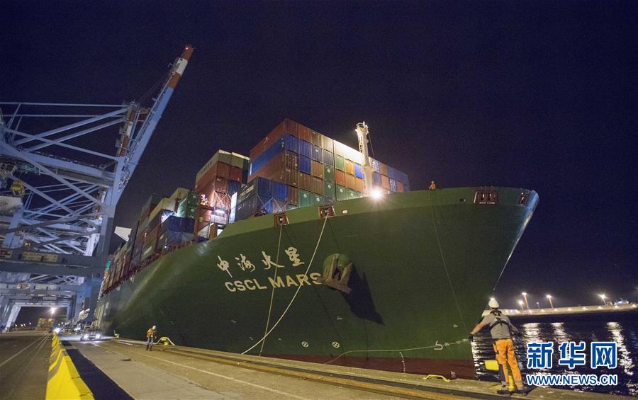 10月15日晚,中遠(yuǎn)海運(yùn)旗下的“中?;鹦恰碧?hào)集裝箱輪??吭诒壤麜r(shí)澤布呂赫港集裝箱碼頭。 新華社記者 葉平凡 攝