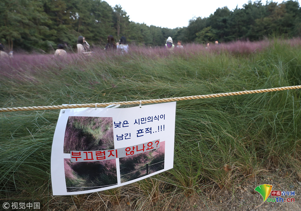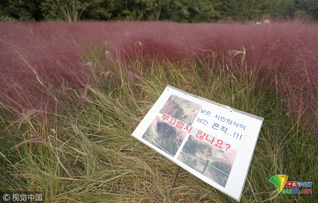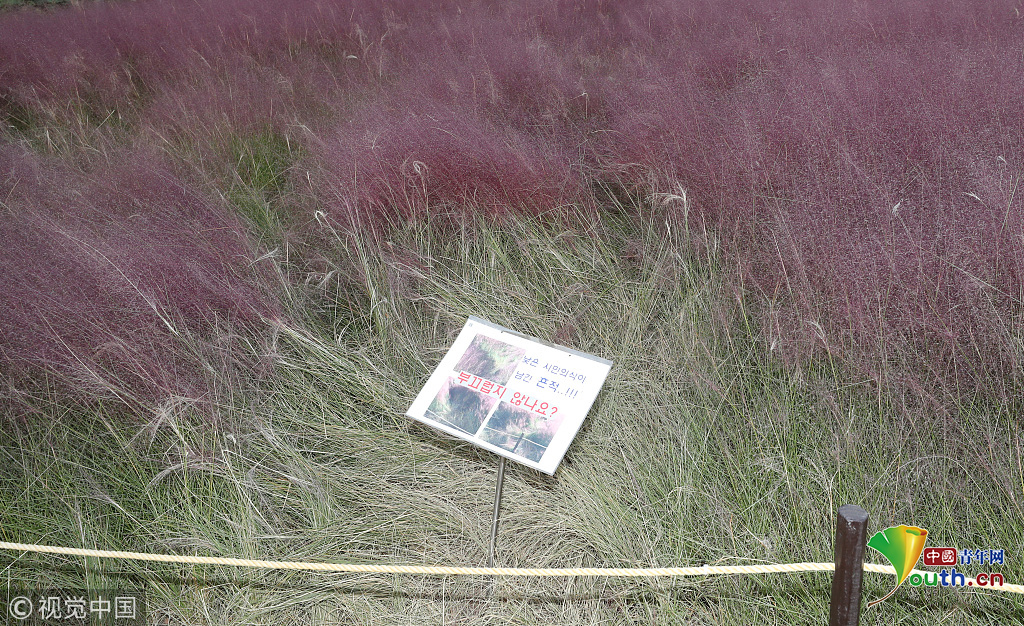 當(dāng)?shù)貢r(shí)間2018年10月16日,韓國蔚山,近日,蔚山公園大片粉黛亂子草盛開,粉紅花海浪漫十足,但部分花海遭游客隨意踩踏。公園并沒有修復(fù)遭破壞區(qū)域,而是用繩索圍起并掛上批判性告示,呼吁游客腳下留情。圖片作者:Yonhap News Agency