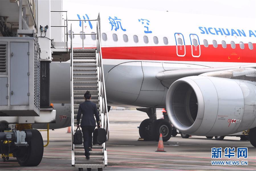 10月16日,航班抵達重慶江北國際機場后,湯春燕第一個走出艙門,準(zhǔn)備迎接旅客下機。 新華社記者王全超攝