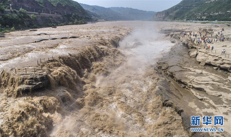 7月19日,游客在陜西境內(nèi)的壺口瀑布群前留影。 新華社記者陶明 攝