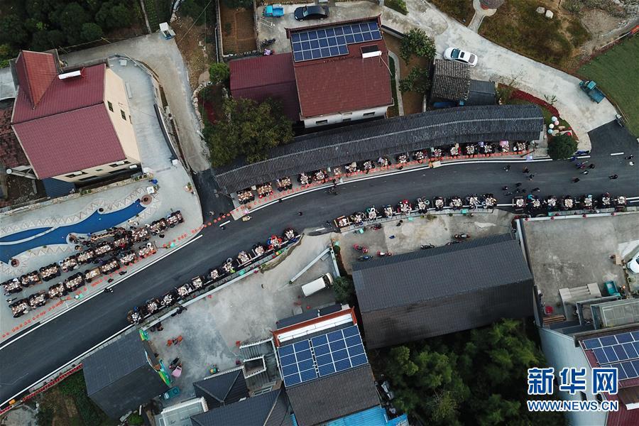 10月17日,村民與賓客在龍峰民族村參加“長(zhǎng)桌宴”(無人機(jī)拍攝)。 當(dāng)日,在浙江省桐廬縣莪山畬族鄉(xiāng)龍峰民族村,一百桌宴席沿道路擺成一字長(zhǎng)蛇陣,四方賓客和當(dāng)?shù)卮迕褚黄鹌穱L著具有畬族特色的菜肴,場(chǎng)面頗為壯觀。 新華社記者 黃宗治 攝